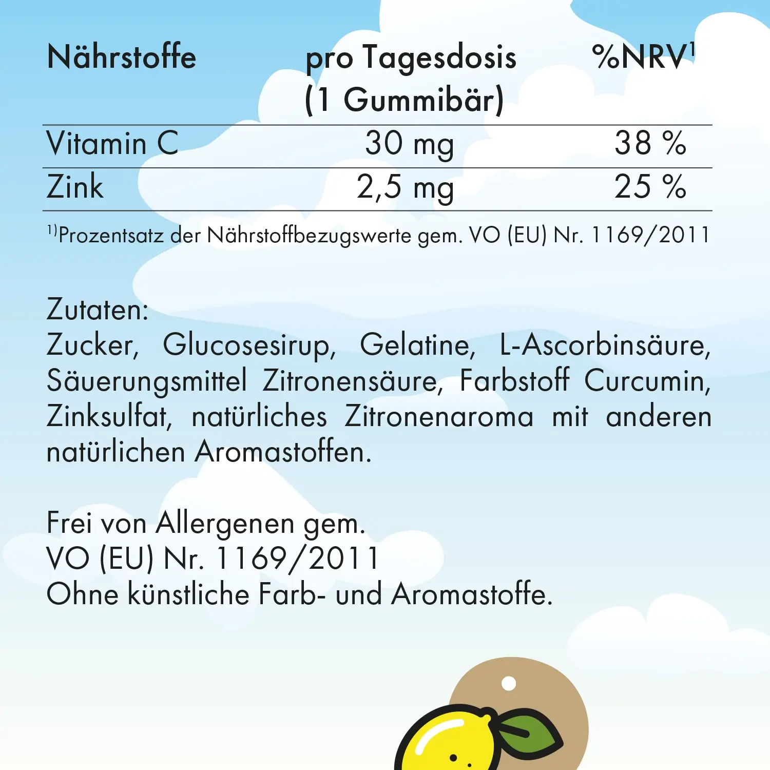 Die leckeren Gummibärchen mit Zitronengeschmack sind die perfekte Vitamin C- und Zink- Quelle für kleine und große Naschkatzen. Die beiden Nährstoffe sind für die normale Funktion des Immunsystems unerlässlich, eine ausreichende Versorgung ist daher sehr wichtig für starke Abwehrkräfte. Vitamin C und Zink unterstützen neben dem Immunsystem auch die Gesundheit der Haut und der Knochen. Die Gummibären enthalten keine Konservierungsstoffe und keine künstlichen Farb-, Süß- und Aromastoffe.